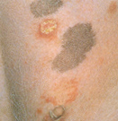 | かゆみを伴った膨疹が発作性に発現し、短時間で消失するものを蕁麻疹と呼ぶ。アレルギー性のものと非アレルギー性のものがある。アレルゲンとしては食餌(魚介類)、薬物などがあり、非アレルギー性のものは湿度、日光などに原因がある。 | |